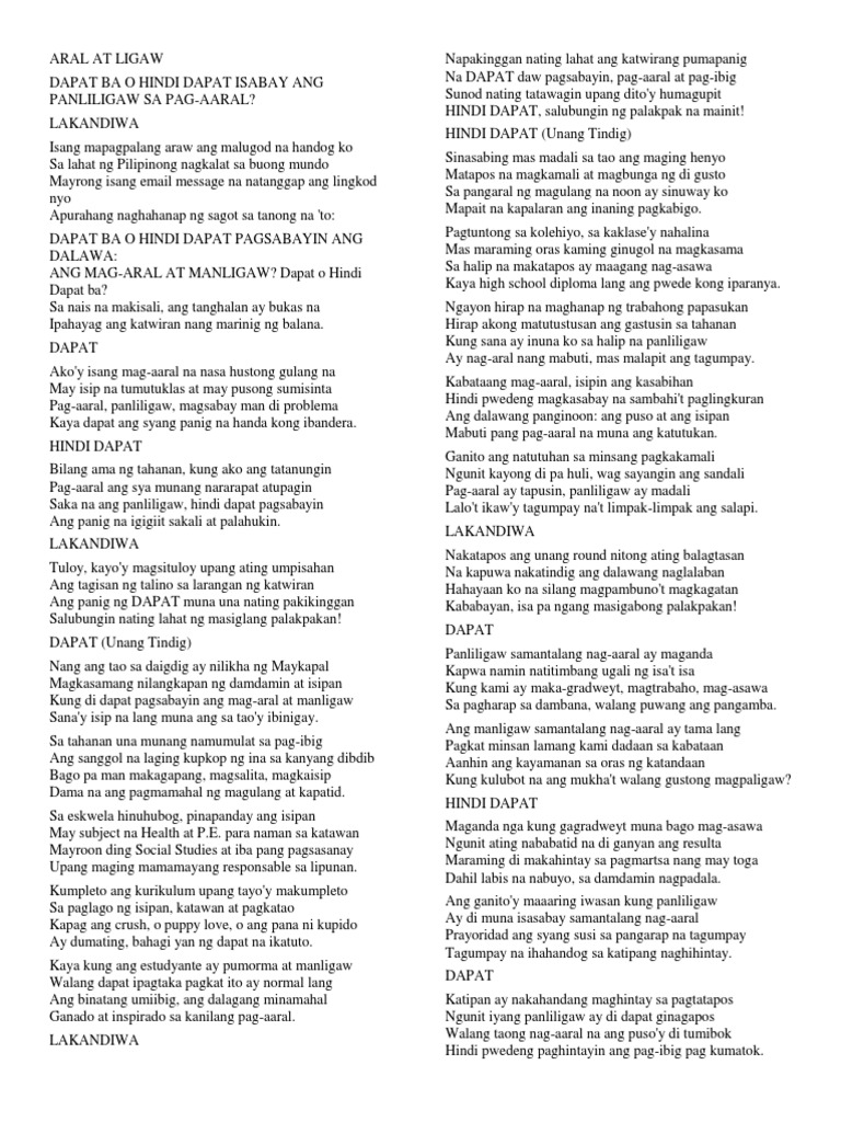 Dapat o Hindi Dapat ba. Balagtasan script dapat o hindi dapat. Balagtasan pag ibig sa kabataan dapat ba o hindi.